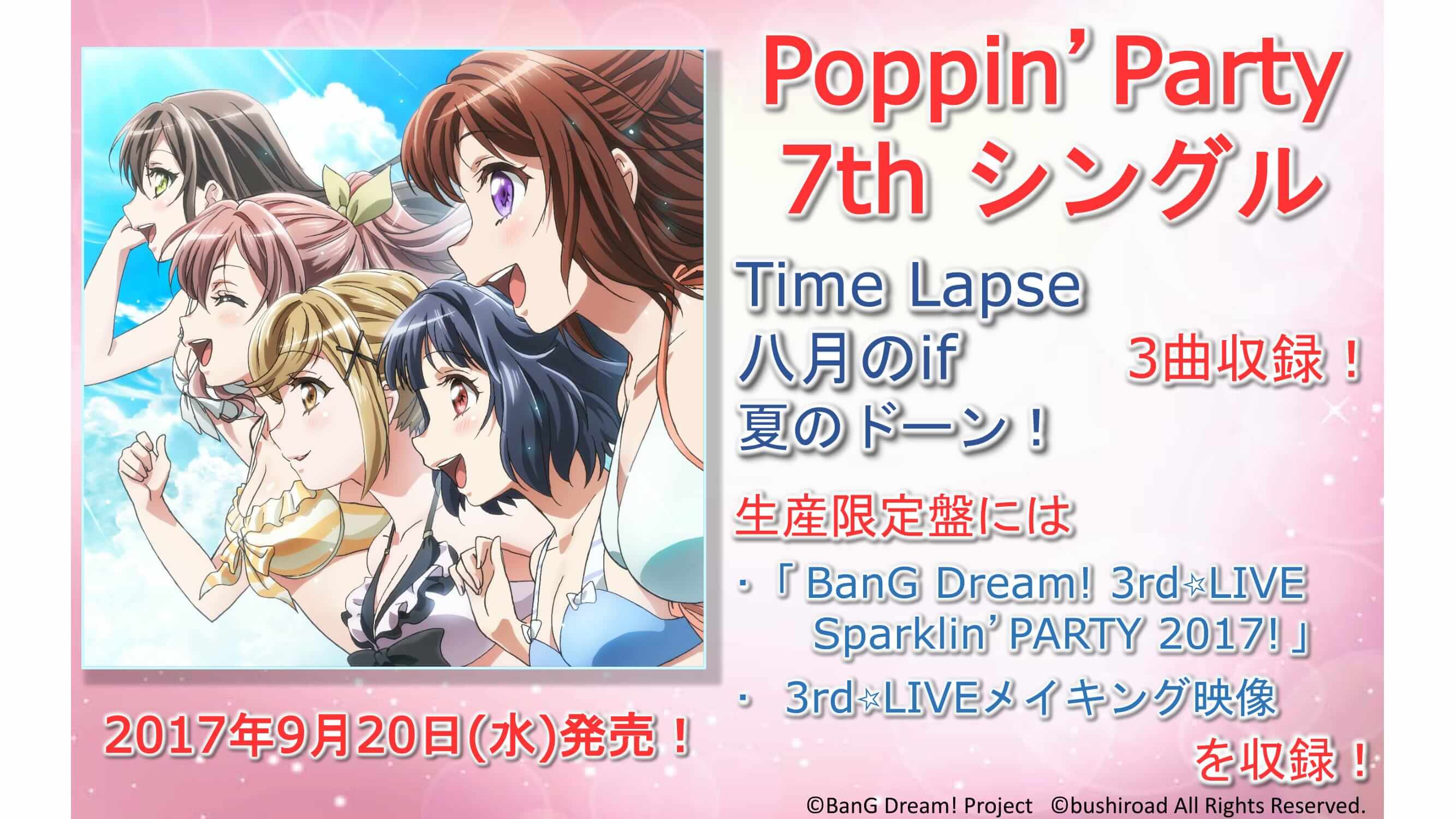 そして黒いシャツとスカートという全身黒の衣装で登場したPoppin’Partyは、9月に発売される7thシングルや月刊ブシロード9月号、コミック版 BanG Dream!の第2巻、8月22日(火)より開始されるローソンとのコラボキャンペーンの告知を行う。