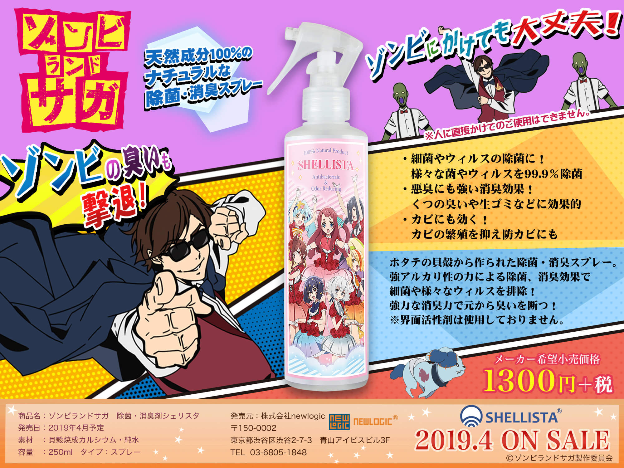 除菌・消臭スプレー「シェリスタ」のTVアニメ『ゾンビランドサガ』バージョンが、2019年4月に発売される。同製品は、純水と貝殻焼成カルシウムのみから作られた保存料未使用かつ無香料な製品で、「ゾンビィ」の臭いや、ライブ後の汗の臭い対策にも使える便利なアイテムだ。