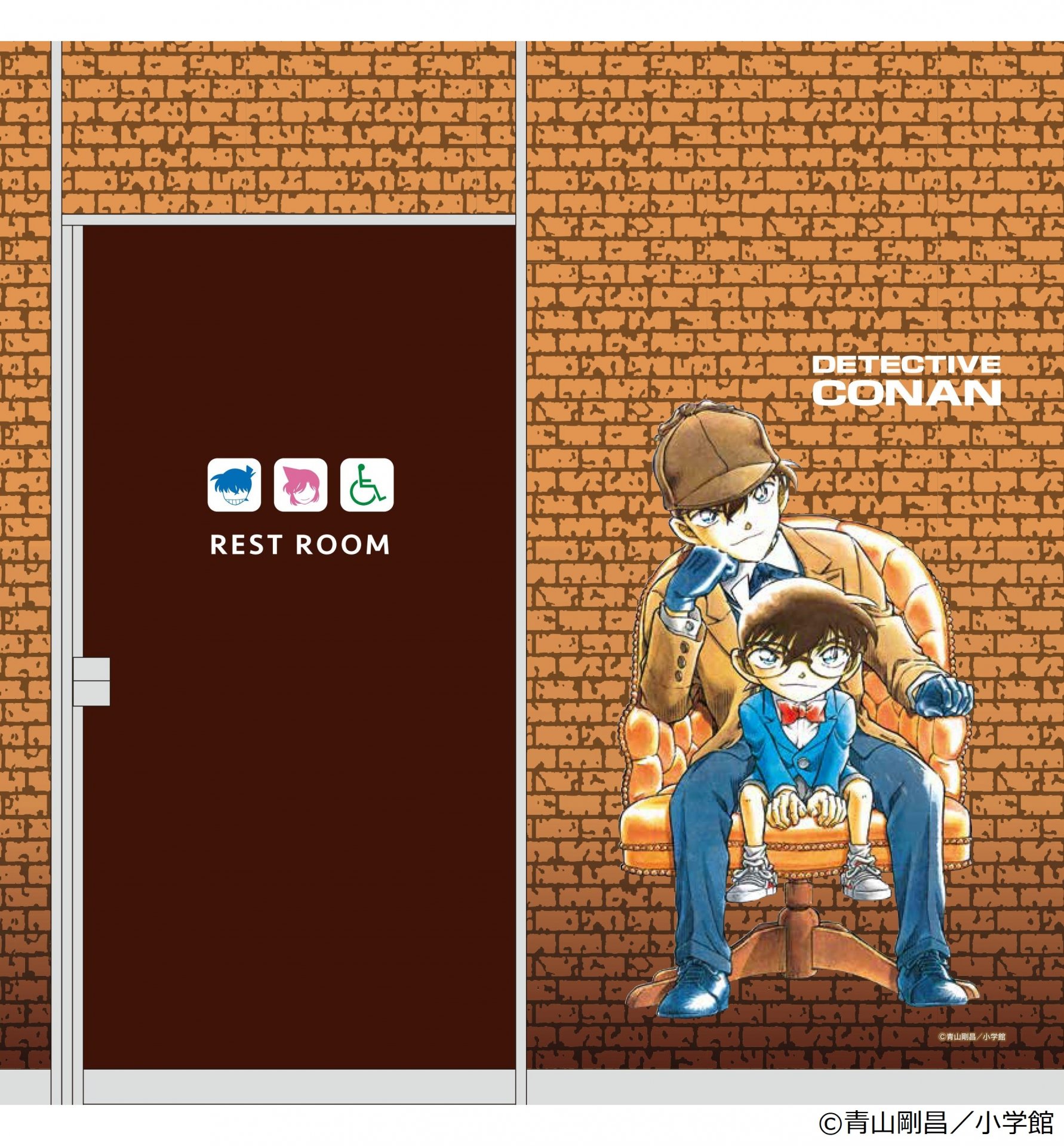 内装(トイレ入り口)にも、コナンと探偵風衣装の工藤新一のイラストが施され、
