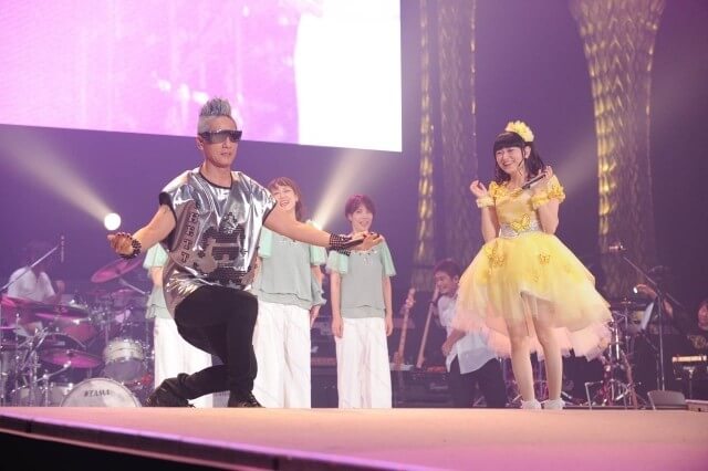 そして、ここで2014年以来の出演となる田村ゆかりが登場。まずは「秘密の扉から会いにきて」で会場の雰囲気をガラリと変え、ピンク色のサイリウムが溢れる世界を作り上げてゆく。続く「You & Me」ではmotsuがパフォーマンスに加わり、観客と一緒に同曲を大合唱し、その実力を見せつけた。その後はアニメ『ラブライブ!サンシャイン!!』から派生したユニット・Aqoursがステージに勢ぞろい。