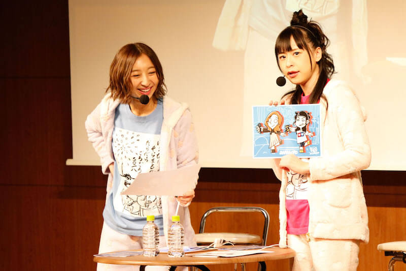 『りっぴーそらまるのだらだらごろごろ』は「この世の遊びを、遊びつくす!」をテーマに、”りっぴー”(飯田里穂)と”そらまる”(徳井青空)が、だらだらごろごろと遊びまくる番組。今回のイベントは文化祭がテーマとなっており、ホワイエにはウェルカムボードや番組内で作成したイラストの展示、記念スタンプが設置されるなど文化祭の名にふさわしい賑やかなものとなっていた。