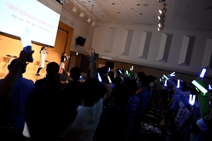 この日は『BATON=RELAY』の新しいムービー上映からスタート。ムービーには町田の街並みが描かれており、会場までの道中と同じような風景がアニメーションのなかにも登場していた。ムービーが終わると同時に出演者4人が登壇し、オリジナル曲「Start me up」を披露。