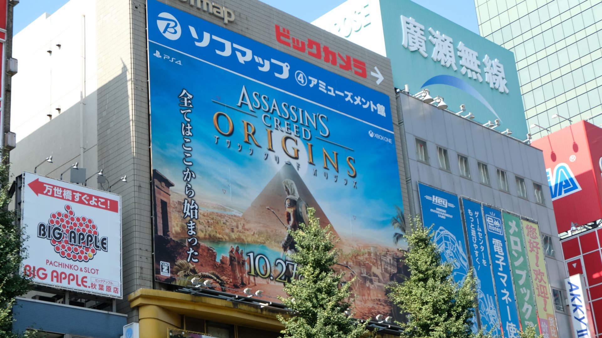 ソフマップAKIBA④号店 アミューズメント館では、正面の大きな看板にゲーム『アサシン クリード』シリーズの新作タイトルの広告が張り出され、入り口ではゲーム『真・女神転生 DEEP STRANGE JOURNEY』、『初音ミク Project DIVA Future Tone DX』がありました。10月のソフマップAKIBA④号店 アミューズメント館はゲーム系の看板で埋め尽くされています!